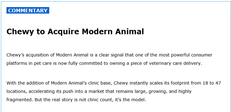 The opening blurb says … Chewy’s acquisition of Modern Animal is a clear signal that one of the most powerful consumer platforms in pet care is now fully committed to owning a piece of veterinary care delivery. With the addition of Modern Animal’s clinic base, Chewy instantly scales its footprint from 18 to 47 locations, accelerating its push into a market that remains large, growing, and highly fragmented. But the real story is not clinic count, it’s the model.