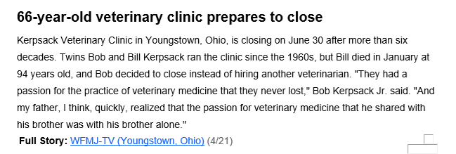 Kerpsack Veterinary Clinic in Youngstown, Ohio, is closing on June 30 after more than six decades. Twins Bob and Bill Kerpsack ran the clinic since the 1960s, but Bill died in January at 94 years old, and Bob decided to close instead of hiring another veterinarian. “They had a passion for the practice of veterinary medicine that they never lost,” Bob Kerpsack Jr. said. “And my father, I think, quickly, realized that the passion for veterinary medicine that he shared with his brother was with his brother alone.”
