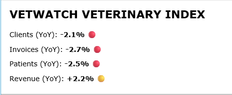 These stats show that the number of veterinary clients, veterinary invoices, and veterinary patients are down year-over-year by more than 2%. The small bump (also 2%-ish) in revenue is likely due more to increasing fees, not actual increases in services.